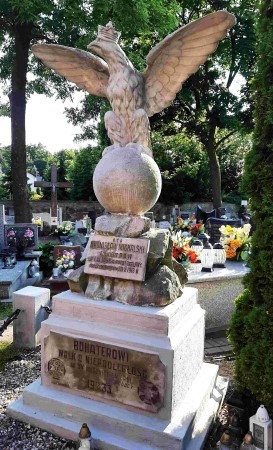 Die ehemaligen katholischen und evangelischen Teile des Friedhofs gehen ineinander über. Die Metall-Grabplatten der deutschen Soldaten auf dem katholischen Teil wurden vom Verfasser aus Zeitmangel nicht gefunden. Man kann sie auf folgender Seite sehen: rowery.olsztyn.pl/wiki/miejsca/1914/kujawsko-pomorskie/lipno. Dort ist auch ein ebenfalls nicht gefundenes Grabdenkmal für 26 unbekannte gefallene russische Soldaten abgebildet. Die fehlenden Namen wurden von den Fotos auf obiger Seite notiert. Das prächtige Grabdenkmal für den erschossenen russischen Kriegsgefangenen wurde 1933 errichtet von der „Polnischen Gesellschaft zur Pflege der Gräber der Helden“.
