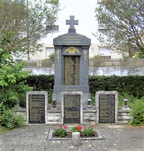 Stein mit Kreuz, darunter eine Inschrift der Gemeinde und eine eingelassene Tafel mit den Namen der Gefallenen des Ersten Weltkriegs, davor stehen drei Tafeln mit den Namen des Zweiten Weltkriegs.