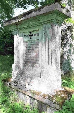 Denkmal für die Gefallenen des Ersten Weltkriegs auf dem verwilderten ehemaligen evangelischen Friedhof nordöstlich des Ortes: Errichtet in Form eines Tempels aus Sandstein mit EK-Zeichen im oberen Bereich.