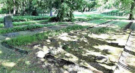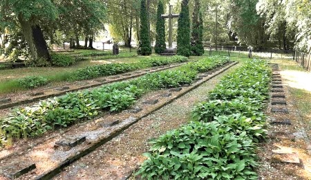 Große Kriegsgräberstätte für Gefallenen des Ersten Weltkriegs an der Moniuszko Straße am Popówka Mała See: Lange winklige Fläche mit mehreren Reihen flacher Grabplatten und einem hohen Metallkreuz am Ende. Hier ruhen 243 deutsche und 175 russische Soldaten dieses Krieges und sieben deutsche und mindestens zehn ausländische Soldaten des Zweiten Weltkriegs.
