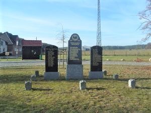 Kriegerdenkmale für die Gefallenen des Ersten und Zweiten Weltkriegs: Drei Stelen, die mittlere, höhere für die Gefallenen des Ersten Weltkriegs.