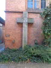 Steinernes Kreuz an der Fassade der katholischen Propsteikirche „Herz Jesu“.
