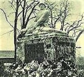 Ehemaliges Denkmal für die Gefallenen des Ersten Weltkriegs neben der Kirche: Quader aus Natursteinen mit eingelassenen Widmungs- und Namenstafeln, gekrönt von den Figuren eines liegenden Soldaten und eines daneben knienden Kameraden mit Stahlhelm (nach 1945 abgerissen).