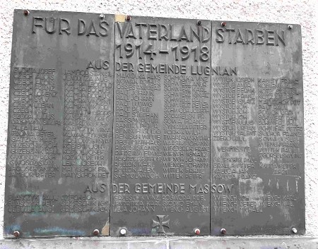 Das Denkmal stand in der Nähe der Kirche und wurde nach 1945 komplett abgerissen. Die Namenstafeln blieben zum Glück erhalten und wurden nach der politischen Wende an der Kirchenaußenmauer angebracht.