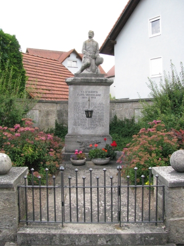 In die Mauer hinter dem Denkmal sind 3 Steintafeln mit den Namen und Einheiten der Teilnehmer des 1. Weltkrieges eingemauert.