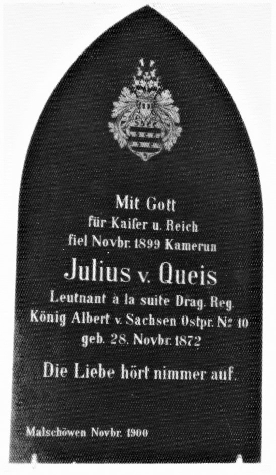 Nach 1945 wurde in Ostpreußen die deutsche Bevölkerung vertrieben und die meisten Denkmäler abgerissen, beschädigt oder umgewidmet. Im Ort ist kein Gedenken an gefallene Einwohner des 1. Weltkriegs erhalten. Ob die Gedenktafel in der Kirche noch existieret ist unklar. Im Kamerun des Jahres 1899 gab es drei militärische Auseinandersetzungen mit aufständischen Einheimischen, gegen die Bangwa, Bule und Fulbe. In welcher davon Leutnant von Queis fiel ist unklar. Laut Verlustliste Kamerun soll er im Stationsbezirk Nssakpe gefallen sein.
