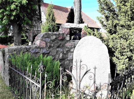 Denkmal in einer Ecke der Kirchhofmauer: Halbrunde Natursteinwand mit eingelassenem Eisernen Kreuz, davor ein Findling mit Widmung.