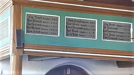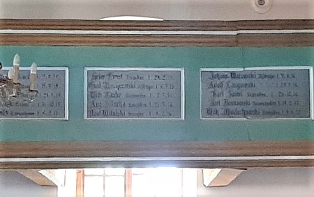 Namen der Gefallenen aufgemalt auf der Empore der Kirche.