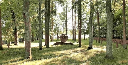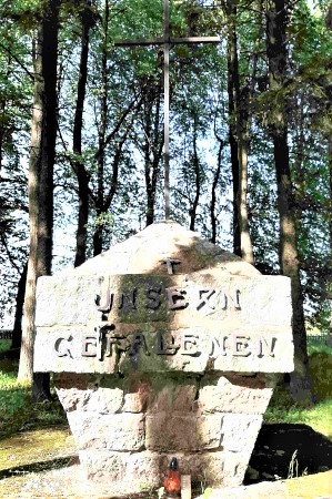 Kriegsgräberstätte für Gefallene des Ersten Weltkriegs nördlich des Dorfes: Zentrales Denkmal mit breitem dreistufigem Sockel und einem nach unten verjüngtem Block aus Natursteinen mit krönendem Metallkreuz. Grabkreuze aus Stein im Viereck um das Denkmal.