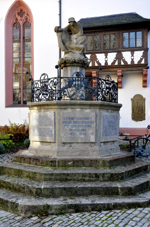 Das Denkmal, eingebettet in einen Brunnen, steht vor der ev. Kirche St. Nicolai in der Ortsmitte.