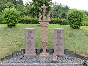 Sandsteinsäule mit einer Kreuzigungsszene, links und rechts daneben zwei Gedenksteine.