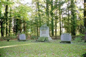 In einer umzäunten Anlage, von hohen Bäumen umgeben, Ehrenmal für die Kriegstoten des Ersten Weltkrieges. Auf gestuftem Sockel vorderseitig die Inschrift.