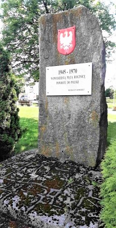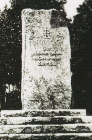 Denkmal für die Gefallenen des Ersten Weltkriegs auf dem zentralen Platz des Ortes: Aufgerichtete Steinplatte mit EK-Zeichen im oberen Bereich. Nach 1945 wurden am Stein alle deutschen Insignien entfernt und polnische Inschriften angebracht.