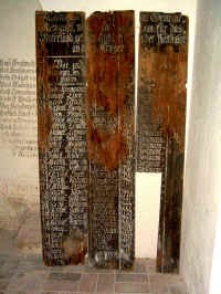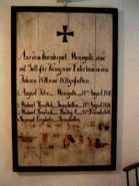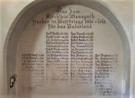 Die beidseitig im Turmraum auf dem Putz aufgemalten Namen der Gefallenen des 1. Weltkriegs sind leider teilweise verblasst. Auf der einen Seite stehen Namen mit den Todesjahren 1914-1916, die nur im unteren Bereich unlesbar sind. Auf der anderen Seite mit den Todesjahren 1917-1918 sind nur zwei Namen mit Mühe ablesbar. Einige unsichere Namen konnten aus den offiziellen Verlustlisten des 1. Weltkriegs bestätigt werden. Lesbare Aufnahmen der kompletten Inschriften oder Aufzeichnungen der Namen werden gesucht (ebenfalls zur zerfallenen Tafel des Krieges 1813-1815).