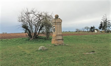 Denkmal im Ort mit Kugel auf der Spitze, Vorderseite oben mit Eisernem Kreuz, darunter umlaufend ein Lorbeerkranz als Relief,