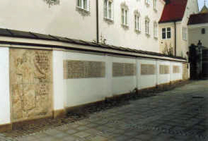 Gedenktafeln an der Mauer zum Franziskanerinnenkloster Hl. Kreuz, südwestlich der Pfarrkirche St.Stephan.