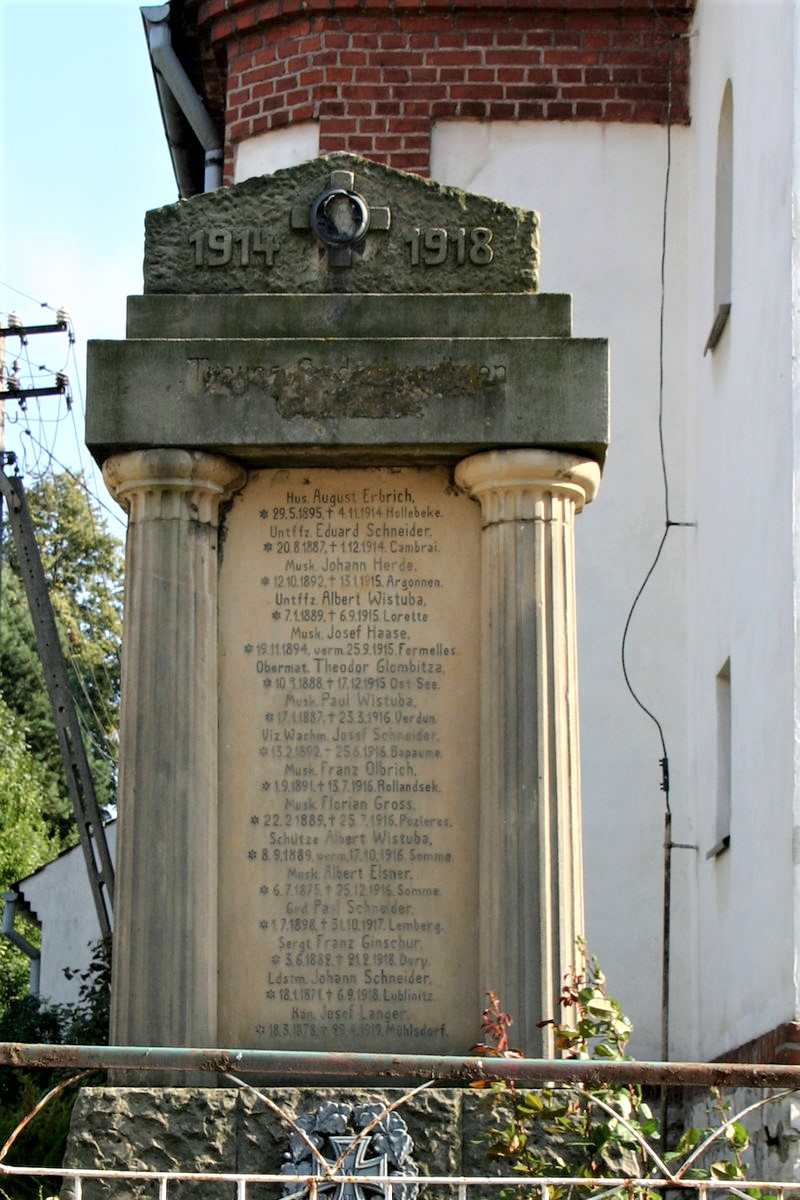 Spitze mit Kreuz und Jahreszahlen 1914 1918. Standort etwas erhöht vor der Dorfkirche St. Lukas.