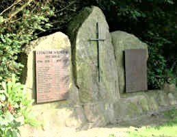Auf dem Friedhof von Negenborn drei Findlinge auf Sockel. Der Mittlere mit einem Kreuz, Gusstafeln auf den beiden äußeren Steinen