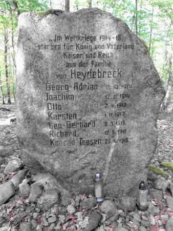 Denkmal für die Gefallenen der Gutsbesitzerfamilie von Heydebreck im Ersten Weltkriegs in Form eines aufgerichteten Findlings, errichtet im Gutspark.