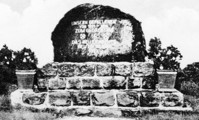 Nach 1945 wurde in Ostpreußen die deutsche Bevölkerung vertrieben und die meisten Denkmäler abgerissen, beschädigt oder umgewidmet. Hier wurde der Findling vom Sockel gestoßen und der Platz verwilderte. Bilder in dem traurigen Zustand kann man auf folgender Seite sehen: rowery.olsztyn.pl/wiki/miejsca/1914/warminsko-mazurskie/nowe_kiejkuty. Erst 2011 wurde wieder ein Findling aufgesetzt und eine Gedenktafel zum 620. Jahrestag der Gründung des Ortes angebracht.