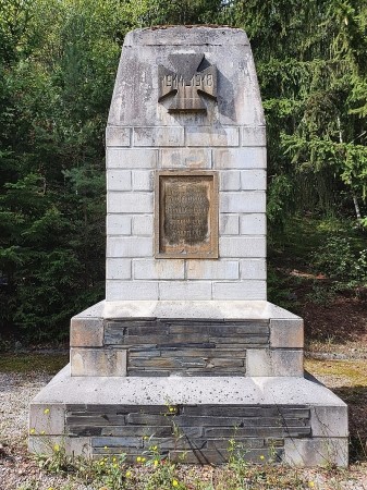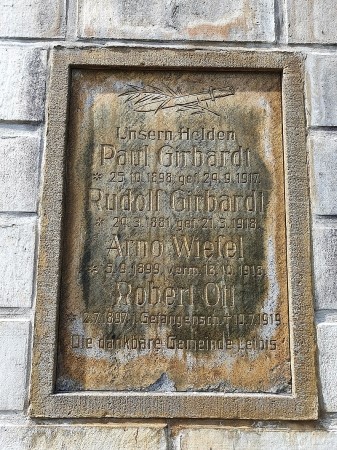 Das gemauerte Denkmal auf gestuftem Unterbau enthält die Tafel des Denkmals von Leibis.