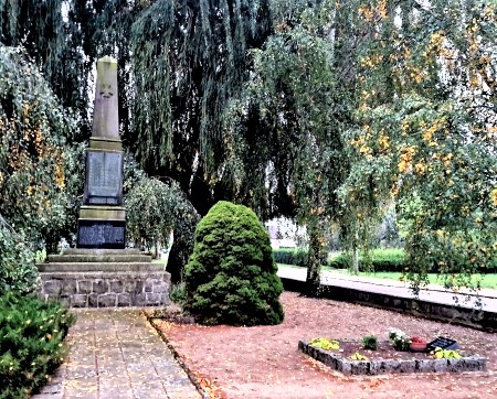 Eine hohe, spitz zulaufende, Steinsäule auf treppenartigem Podest. Vorne die Namenstafeln mit den Gefallenen des Ersten und Zweiten Weltkrieges.
