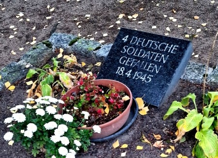 Rechts vor dem Denkmal eine Gedenkplatte für vier deutsche Soldaten.