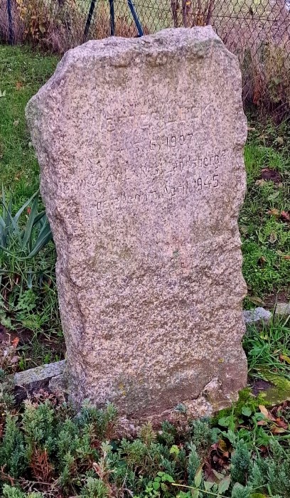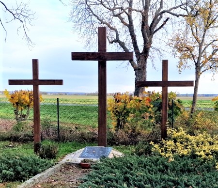 Drei christliche Kreuze kennzeichnen die Kriegsgräberstätte auf dem Friedhof. Davor liegt eine Tafel mit Namen und Daten der Gefallenen.