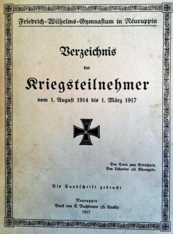 Die Gedenktafel für die Gefallenen des 1. Weltkriegs des Gymnasiums (ohne Namen) ist verschwunden. Der Heimatforscher Pusch hat ein Foto davon besessen, doch er verstarb 2020, ehe er dem Verfasser eine Kopie schicken konnte. Im Museum Neuruppin fand sich keine Aufnahme davon. Vielleicht kann später ein Foto für dieses Kapitel nachgereicht werden.