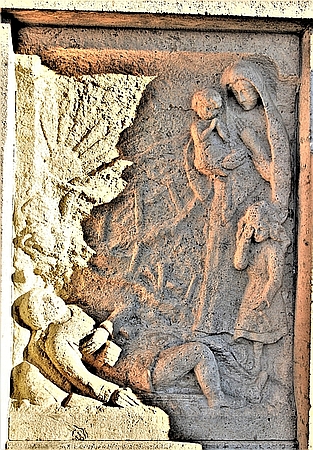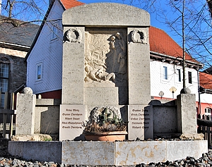 Gedenkstätte für zehn Gefallene im Ersten Weltkrieg (1914-1918) auf dem Lindenplatz an der Kirche. Auf dem Relief ein sterbender Krieger mit Frau und zwei Kindern in Trauer.