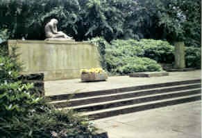 Plateau mit vorgesetzten Stufen und Steinmauer, darauf eine trauernde Frau.
