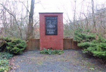 Gemauerte Stele aus Klinkersteinen mit einer steinernen Gedenktafel und einer beidseitigen Einfassungsmauer.