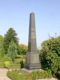 Auf dem Friedhof in Norddrebber ein schlanker schwarzer Obelisk auf gestuftem Sockel und Inschrift im oberen Bereich.