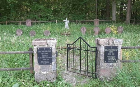 Soldatenfriedhof für Gefallene des Ersten Weltkriegs westlich des Ortes: Natursteinpfeiler und neun Grabsteine, umrandet von einem Holzzaun.