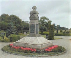 Säule im Zentrum des Friedhofs. An der Spitze ein Eisernes Kreuz, darunter auf jeweils zwei gegenüber liegenden Tafeln die Widmungen und Daten der Gefallenen des Ersten Weltkrieges.
