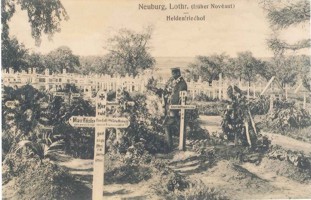Dieses Denkmal, jetzt auf privatem Grund, schmückte einst den Soldatenfriedhof Neuburg i. L, ursprünglich ein Soldatenfriedhof von 1870. Unten ist eine Liste der Soldaten, die dort begraben sind. Die meisten von ihnen erlagen ihren Verletzungen im Feldlazarett in Neuburg, hinter der Front am Priesterwald. Alle diese Soldaten wurden auf dem Soldatenfriedhof Fey begraben. Der deutsche Friedhof in Neuburg existiert nicht mehr.
