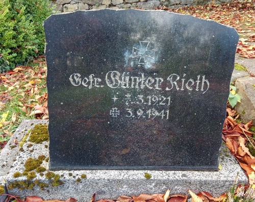 Rieth Günter war zu Ausbildungszwecken als Schüler an der Sturzkampffliegerschule Wertheim. Am 03.09.1941 stürzte die Junkers Ju 87 vermutlich nach Abwurf einer Übungsbombe gegen 15:00 Uhr bei Esselbach – Kredenbach, Lkr. Main-Spessart aus unbekannter Ursache ab. Rieth verstarb beim Aufprall vor Ort. Er wurde nach Oberhambach überführt und dort bestattet.