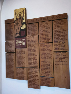 Im Vorraum der Kirche St. Martin in Augsburg-Oberhausen befindet sich in der Abseite ein Denkmal für die Gefallenen des Zweiten Weltkrieges.