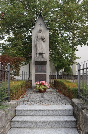 Vor der Kirche befindet sich das Kriegerdenkmal. Eine viereckige Steinsäule, die oben spitz zusammenläuft.