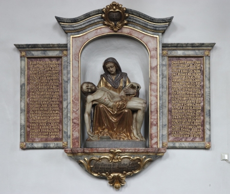 An einer Längswand im Innenraum der Kirche St. Petrus und Paulus hängen zwei Gedenktafeln links und rechts eines Rahmens, der eine Pieta umschließt, die in einer Wandvertiefung steht. Den unteren und oberen Abschluss des Rahmens bildet je eine Inschriftenkartusche.