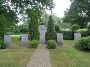 Gedenkanlage auf dem Friedhof von Ochtelbur; Steinkreuz mit Inschrift in der Mitte, beidseitig je zwei Stelen mit den Namen der Gefallenen beider Weltkriege.