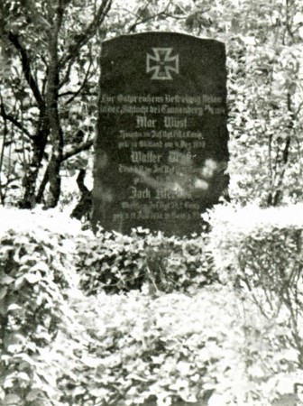 Grab für drei Offiziere im ehemaligen Gutspark: Schwarze aufgerichtete Steinplatte.