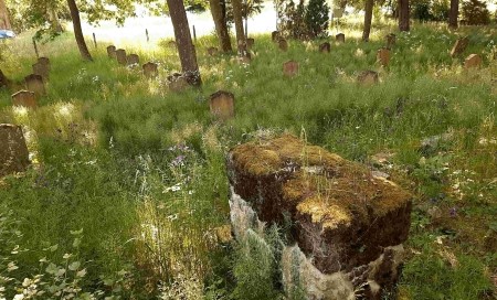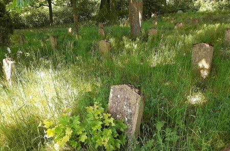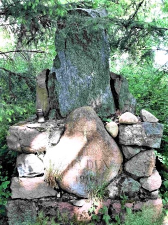 Kriegsgräberstätte für Gefallene des Ersten Weltkriegs südlich des Ortes: Reihen von hohen Grabsteinen mit jeweils mehreren Namen an einem Hang. Oben ein Denkmal aus Feldsteinen mit Widmung. Hier ruhen 302 deutsche und 103 unbekannte russische Soldaten.