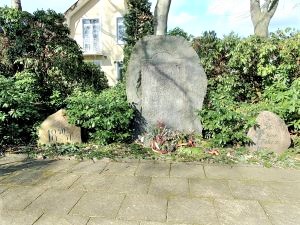 Denkmalanlage Osdorfer Landstraße / Am Eichenplatz, bestehend aus drei Findlingen: Denkmal für die Erhebung Schleswig-Holsteins 1848/51 mit einem Namen (rechts),