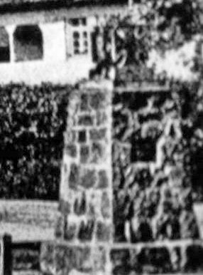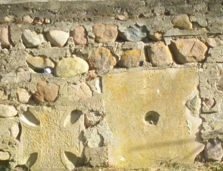 Denkmal für die Gefallenen des Ersten Weltkriegs auf dem Platz vor der Kirche: Aus Feldsteinen gemauerte Stele mit krönendem EK-Zeichen und kleiner eingelassener Widmungstafel. Das Denkmal wurde nach 1945 abgerissen und die Steine in die Kirchhofmauer eingebaut. EK und Deckstein sind darin noch zu erkennen.