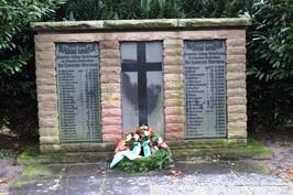 Mauer mit drei Tafeln. Mittlere Tafel mit Kreuz, linke und rechte Tafel mit den Namen der Gefallenen.