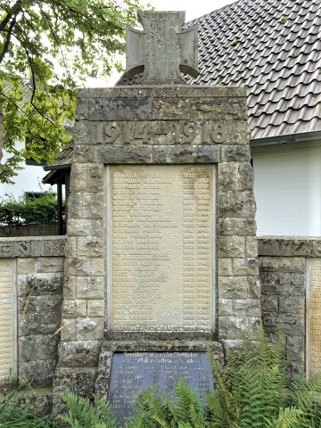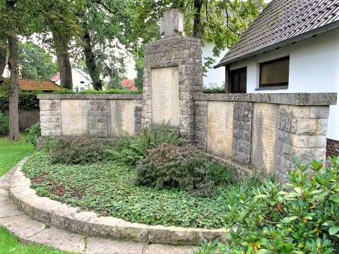 Obelisk, von einem Eisernen Kreuz bekrönt, mit schräg anliegender Gedenkplatte für die Gefallenen des Ersten Weltkrieges und Gedenktafel mit Namen der Gefallenen des Zweiten Weltkriegs aus Otze.