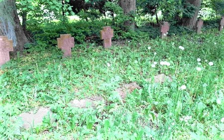 Kriegsgräber für Gefallene des Ersten Weltkriegs in einer Ecke des ehemaligen evangelischen Friedhofs des Ortes: Reihe von Steinkreuzen und flachen Namenssteinen.