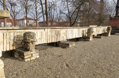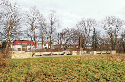 Darunter, bzw. daneben stehen Mauern mit Ziegelsteinen. Die einzelnen Ziegel zeigen die Namen Gefallener aus dem Ersten Weltkrieg. Ebenso weisen überdimensionale Soldatenköpfe (mit. Stahlhelm) auf das 20. Jahrhundert hin.