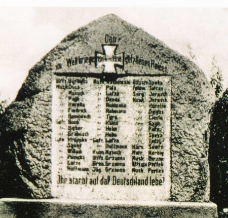 Nach 1945 wurde in Ostpreußen die deutsche Bevölkerung vertrieben und die meisten Denkmäler abgerissen, beschädigt oder umgewidmet. Hier wurde das Denkmal anscheinend nach 1945 abgeräumt und der Stein nach der politischen Wende wieder aufgestellt. Eine Erklärungstafel in Polnisch wurde daneben an einem anderen Stein angebracht. Die Inschriften sind heute selbst mit Hilfsmitteln kaum noch zu entziffern.